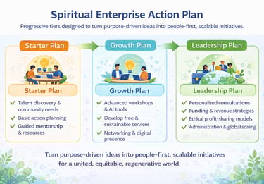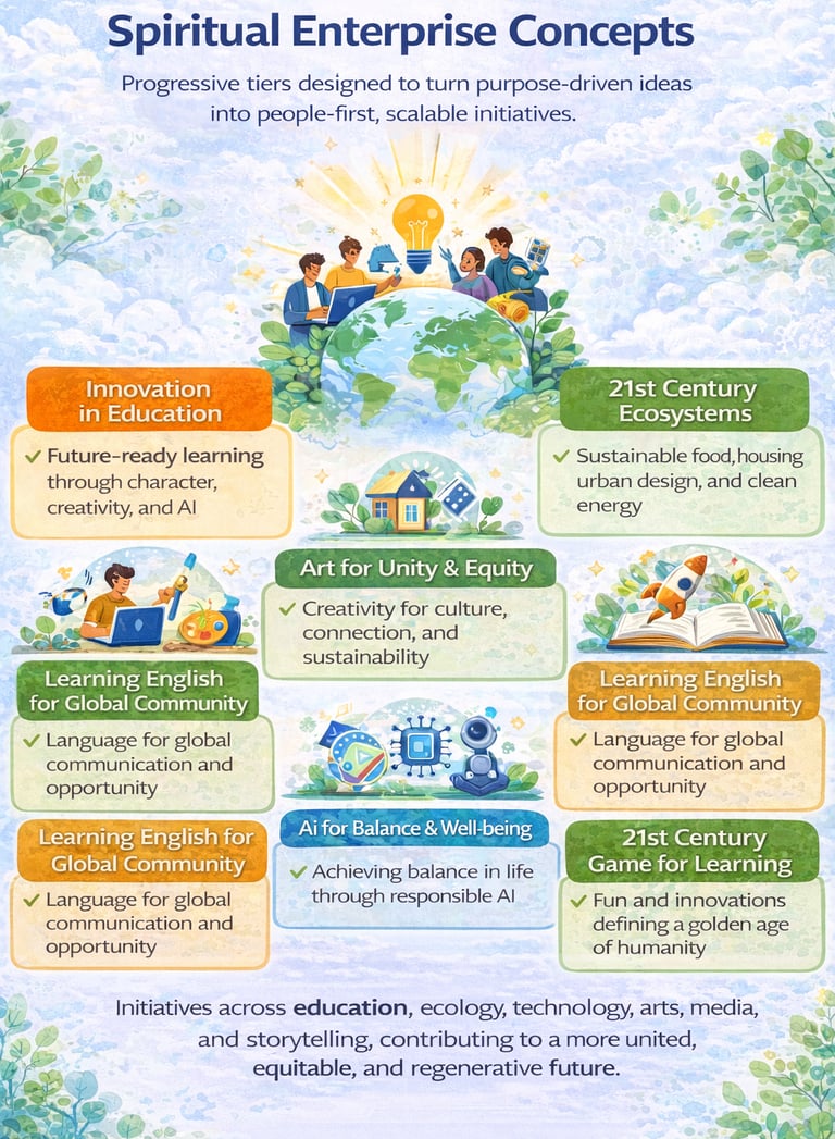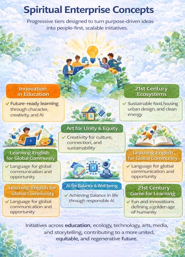 Together, these initiatives demonstrate how spiritual enterprise can evolve across education, ecology, technology, arts, media, and storytelling—each contributing to a more united, equitable, and regenerative future.