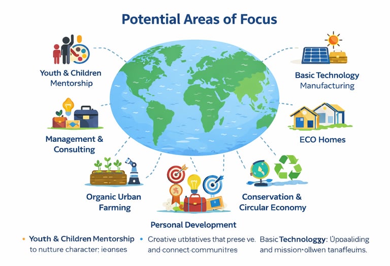 Spiritual enterprise promotes innovation across all fields with a people-first vision for a more united, equitable, and regenerative world. These areas provide clear pathways for youth to turn purpose and creativity into meaningful service while integrating social, economic, and ecological impact.
