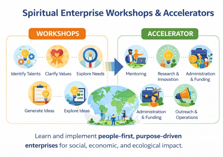 provide a hands-on learning and implementation pathway for youth and emerging entrepreneurs to design and launch people-first, purpose-driven enterprises. The workshop phase introduces participants to core concepts of spiritual enterprise, helping them identify their talents, clarify their values, explore community needs, and generate viable project ideas across social, economic, and ecological fields. The accelerator phase supports participants in turning ideas into action through mentorship, research, AI-supported innovation, and structured planning. Participants develop services or products, build partnerships, strengthen administration and funding strategies, and use digital tools for outreach and operations. Continuous reflection, feedback, and optimization ensure learning remains adaptive and impact-focused. Together, the workshops and accelerator create a practical ecosystem where youth move from learning to implementation, developing scalable, ethical, and regenerative enterprises with a strong global and future-oriented perspective.